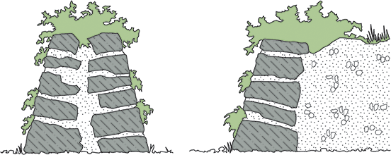 En- og tosidig tørrmur over terreng. Den tosidige er et eksempel på en plantemur, med kjerne av sand eller humusrik jord