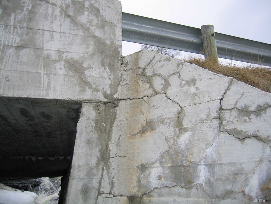 Eksempel på skade i bruvinge, med krakeleringsriss forårsaket av alkalireaksjoner. Foto: SINTEF Byggforsk