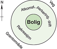 Prinsippskisse for ideell plassering av hovedfunksjoner i forhold til himmelretning
