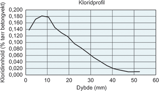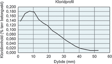 Eksempel på kloridprofil i betong. Kloridkonsentrasjonen avtar gradvis innover i betongen.