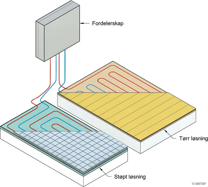 Gulv med vannbåret varme. Hovedløsningene er støpt løsning der varmerørene støpes inn, og tørr løsning med varmerør lagt i varmefordelingsplater.