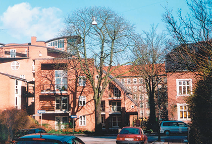 I et område med eldre villabebyggelse er det innpasset ny blokkbebyggelse. Bruk av rød tegl i fasaden og hvitmalte vinduer viderefører materialholdningen i området. To lave bygninger på tre etasjer mot gata har samme bygningsvolum som den eldre villabebyggelsen, men ulik form. I boligblokken bak trappes etasjetallet opp fra tre til seks etasjer. Boligbebyggelsen rommer et seniorbofellesskap. Arkitekt: Boks 25 arkitekter. Foto: Lene Schmidt.