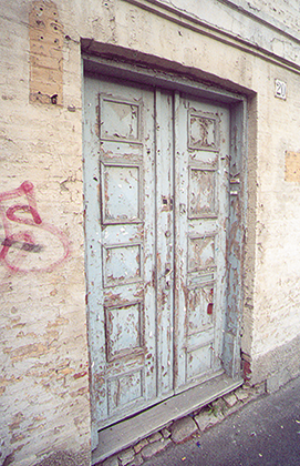 Tredør og slemmet teglfasade med oppsprukken maling