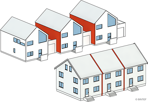 Denne anvisningen beskriver hvordan man utfører bærende og ikke-bærende skillevegger mellom boenheter i vertikalt delte rekkehus og kjedehus av tre som kan oppføres i brannklasse 1. Utførelse av skillevegg i kjedehus hvor to eller flere selvstendige boliger er knyttet sammen av garasje/carport og/eller utvendig bod, er også beskrevet.