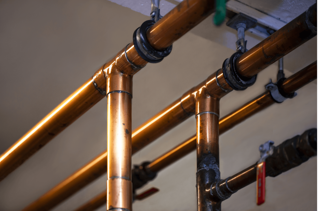 Eksempel på synlige vannrør av kobber med loddeskjøt. Tallene i denne anvisningen kan brukes som veiledning for når man kan forvente at de har behov for å skiftes ut. Foto: SINTEF