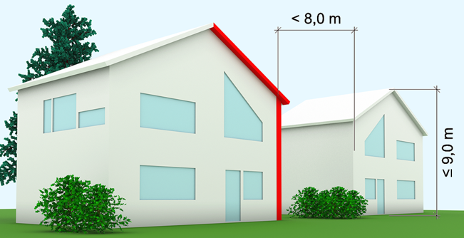 Det er behov for branncellebegrensende bygningsdeler mellom bygninger med gesims- eller mønehøyde inntil 9,0 m og som ligger nærmere enn 8,0 m til bygning i annen bruksenhet, for eksempel frittliggende eneboliger og kjede- eller rekkehus.