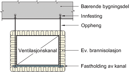 Denne anvisningen beskriver opphengssystemer for tekniske installasjoner, som ivaretar krav til brannmotstand. Anvisningen gjør rede for generelle krav til opphengssystemene og angir maksimale verdier for belastning avhengig av brannpåkjenning. Anvisningen gir også eksempler på aktuelle komponenter for oppheng og innfesting av rør, kanaler og kabelbroer.