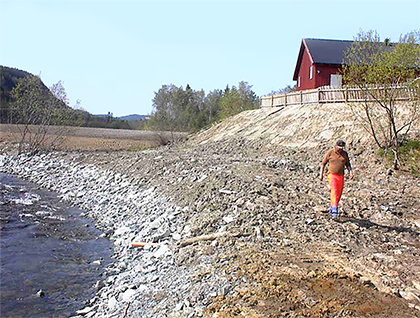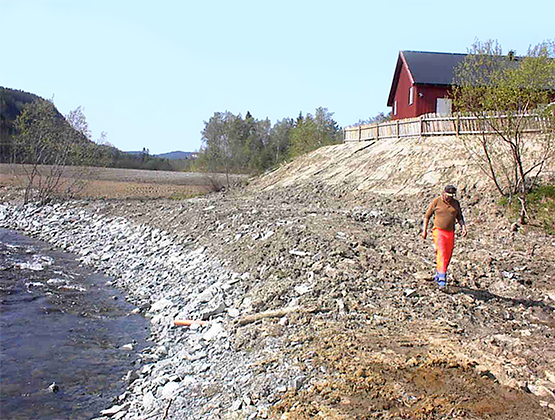 Erosjonssikring og motfylling som sikringstiltak etter leirskred. Leksa i Sør-Trøndelag. Foto: Mads Johnsen, NVE