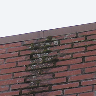 Beslaget har fall ut mot fasaden, har uttette skjøter og er avsluttet helt inntil vegglivet. Dette har ført til nedfukting og begroing av fasaden. Se også tilsvarende uheldig løsning i fig. 21. Foto: Byggforsk