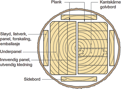 Eksempel på uttak av ulike trelastprodukter fra tømmerstokken
