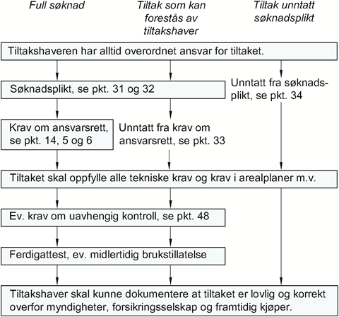 Denne anvisningen forklarer plan- og bygningslovgivningens bestemmelser om søknadsplikt og saksbehandling av tiltak – både ved nybygging, endring og riving. Anvisningen beskriver også ansvaret til tiltakshaver og kommunen, samt hva som ligger i ansvarsrett og ansvarlige foretak. Videre omtaler den krav om dokumentasjon på de ulike trinnene av byggesaken. Uavhengig kontroll, klage og sanksjoner omtales også.