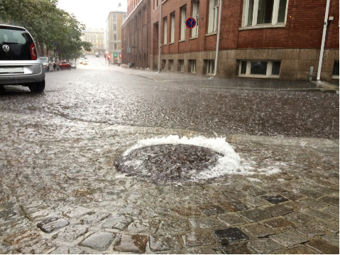 Lokal, kortvarig og intens nedbør har sprengt kapasiteten i overvannsnettet. I urbane områder har slike situasjoner blitt mer vanlig de senere årene. Foto: Svanhild Blakstad, Byggeindustrien