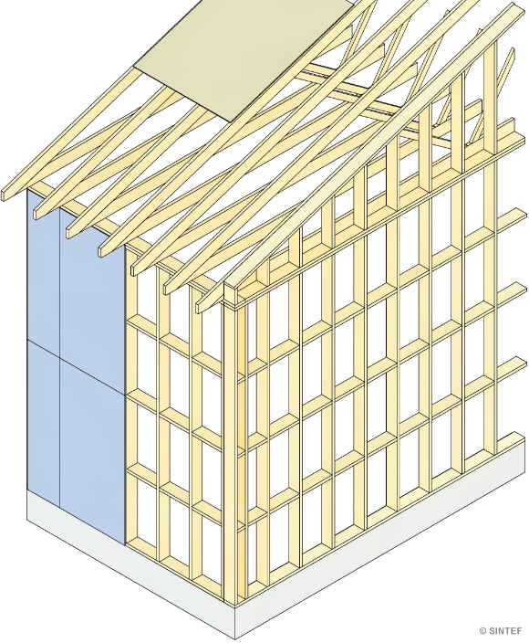 Vindavstiving og -forankring av vegger er behandlet i Byggdetaljer 520.241 og 520.243. Varmeisolering og tetting av yttervegger av bindingsverk er behandlet i Byggdetaljer 523.255.