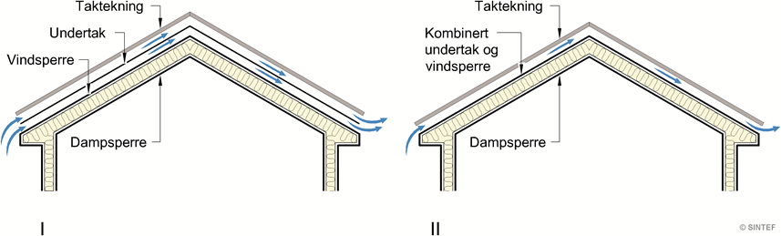 Prinsipp II: med kombinert undertak og vindsperre i ett sjikt (også kalt dampåpent undertak)