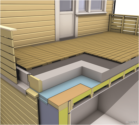 Denne anvisningen beskriver isolert, kompakt terrasse med trebjelkelag over oppvarmet rom. Løsningen er begrenset til terrasser i bygninger med kun én boenhet. Anvisningen behandler blant annet: