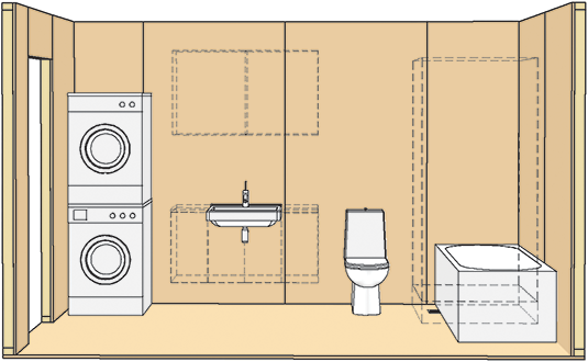 Alle vegger i dette eksemplet er kledd med 18 mm tykk kryssfiner under ett lag gipsplate eller våtromsplate med polystyrenkjerne. Det meste av utstyret kan da monteres uten ekstra spikerslag, se tabell 2 b og pkt. 5.