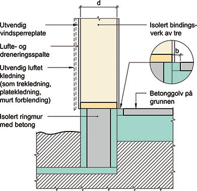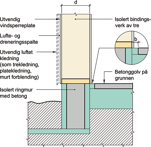 Prinsipiell oppbygning av tilslutning mellom isolert ringmur med betong, vegg med isolert bindingsverk av tre, og betonggolv på grunnen