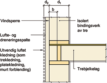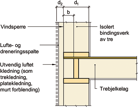 Prinsipiell oppbygning av tilslutning mellom vegger med isolert bindingsverk av tre med kontinuerlig utvendig isolasjon, og trebjelkelag