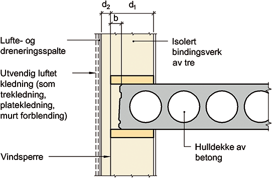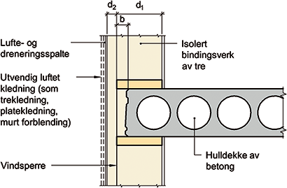 Prinsipiell oppbygning av tilslutning mellom vegger med isolert bindingsverk av tre med kontinuerlig utvendig isolasjon, og hulldekke av betong