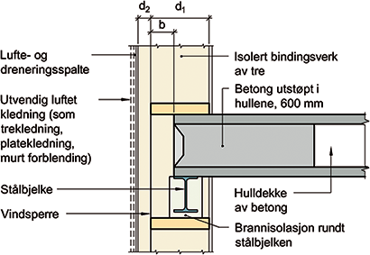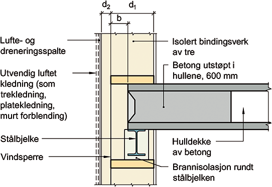 Prinsipiell oppbygning av tilslutning mellom vegger med isolert bindingsverk av tre med kontinuerlig utvendig isolasjon, og hulldekke av betong opplagt på stålbjelke