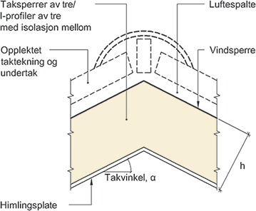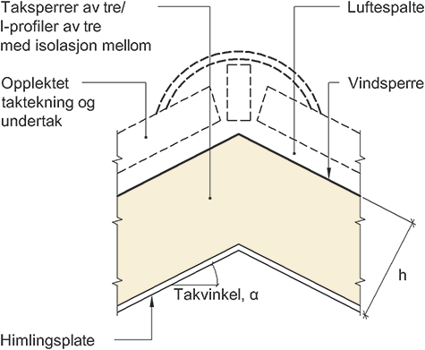 Prinsipiell oppbygning av tilslutning i møne med isolert skrå tretak med taksperrer av konstruksjonstrevirke / I-profiler av tre og opplektet taktekning