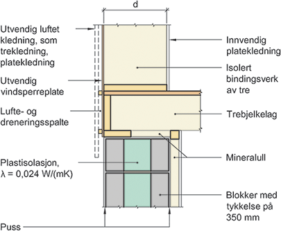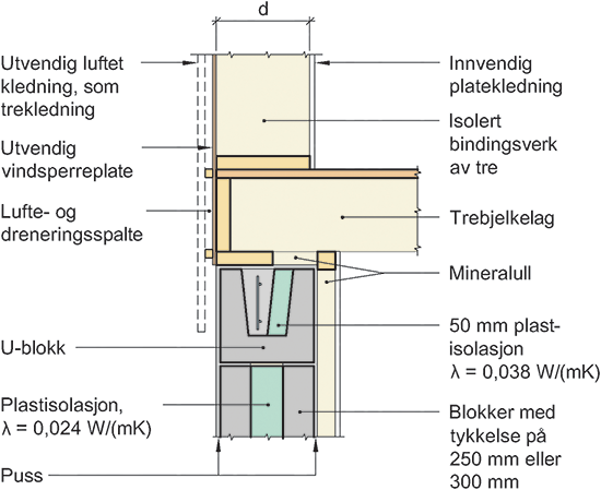 Kuldebroverdier. Vegg av lettklinkerblokker med isolasjon, bindingsverksvegg av tre, trebjelkelag