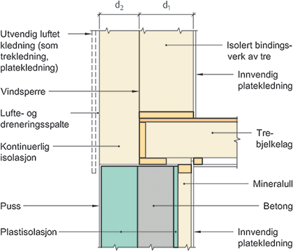 Prinsipiell oppbygning av tilslutning mellom betongvegg, isolert bindingsverksvegg av tre med kontinuerlig utvendig isolasjon og isolert trebjelkelag