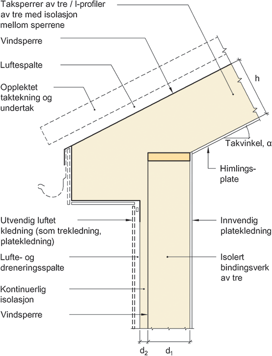 Kuldebroverdier. Isolert skrått tretak og bindingsverksvegg av tre med kontinuerlig utvendig isolasjon