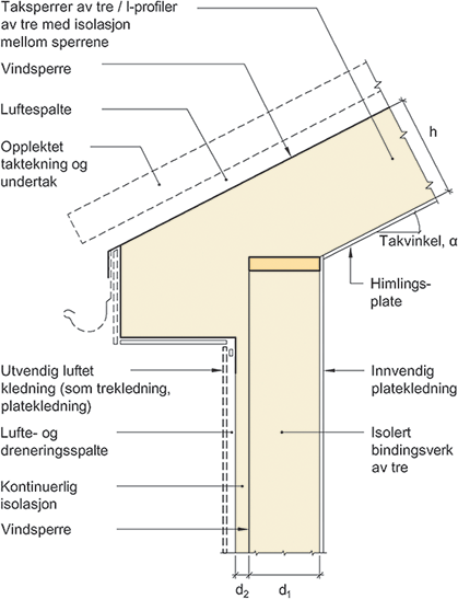 Denne anvisningen inneholder kuldebroverdier, ψ (W/(mK)), for tilslutning mellom isolert skrått tretak og bindingsverksvegg av tre med kontinuerlig utvendig isolasjon. Taket består av taksperrer av konstruksjonstrevirke eller I-profiler av tre og opplektet taktekning. Se fig. 01.