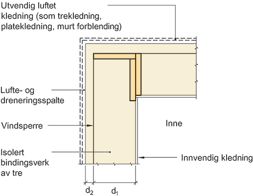 Prinsipiell oppbygning av innovervendt hjørne mellom bindingsverksvegger av tre med kontinuerlig utvendig isolasjon