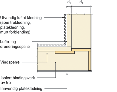 Prinsipiell oppbygning av utovervendt hjørne mellom bindingsverksvegger av tre med kontinuerlig utvendig isolasjon