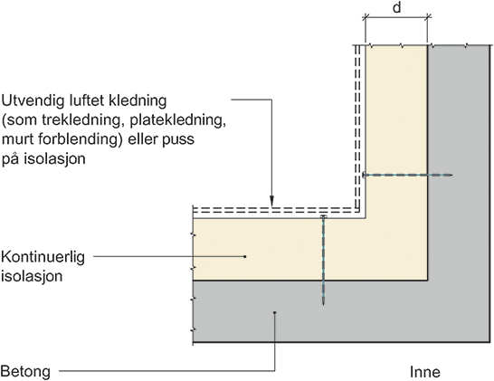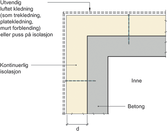 Prinsipiell oppbygning av innovervendt hjørne mellom betongvegger med kontinuerlig utvendig isolasjon