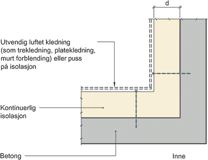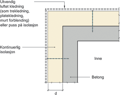 Prinsipiell oppbygning av utovervendt hjørne mellom betongvegger med kontinuerlig utvendig isolasjon