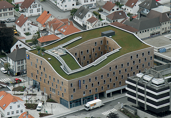 Sammensatt takflate bestående av både skrått og flatt sedumtak
