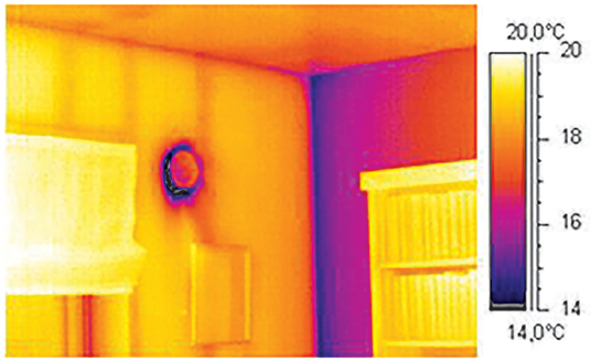 Termogram av yttervegg i bindingsverk av tre med ventil, vindu og innvendig skillevegg i betong, hvor skilleveggen har betydelig lavere temperatur. Illustrasjon: Tormod Aurlien
