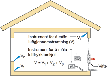 Luftmengden (V˙\mathsf{\dot V}) er like stor som luftmengden i alle lekkasjepunktene V˙1\mathsf{\dot V_{1}} til V˙3\mathsf{\dot V_{3}}