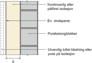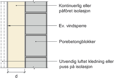 Prinsipiell oppbygning av vegger over terreng, murt av porebetongblokker