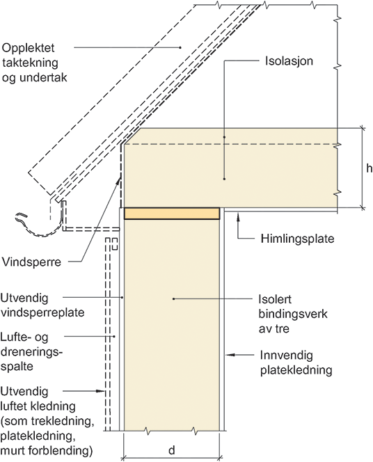 Prinsipiell oppbygning av tilslutning mellom et skrått tretak med kaldt loft og bindingsverksvegg av tre