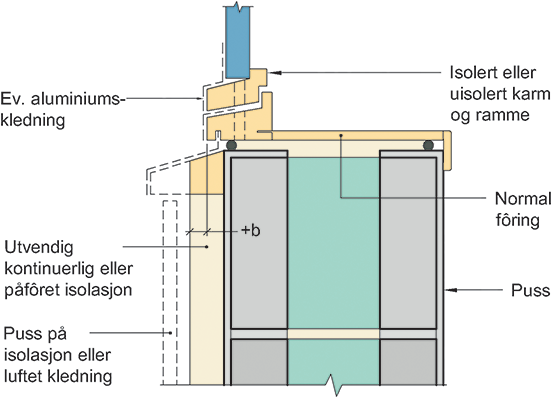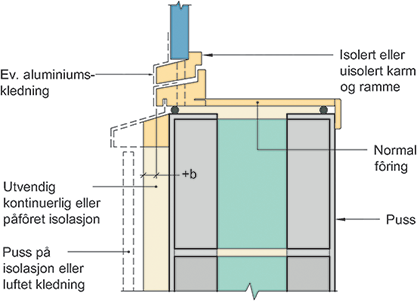 Prinsipiell oppbygning av tilslutning mellom vindu og vegg av lettklinkerblokker med isolasjon. Vinduet er plassert på utsiden av vindsperra.