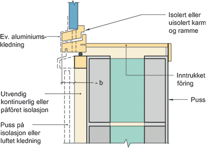 Prinsipiell oppbygning av tilslutning mellom vindu og vegg av lettklinkerblokker med isolasjon. Vinduet er plassert innenfor vindsperra.