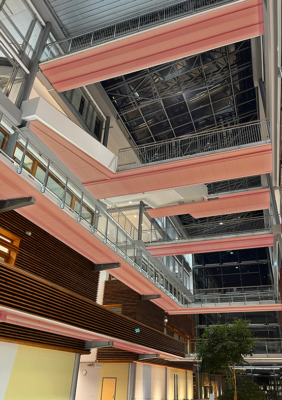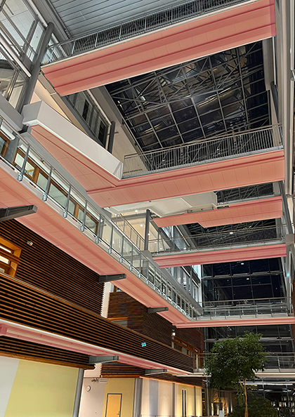 Eksempel på overbygd areal med lydabsorberende flater (synliggjort med rosa farge) på undersiden av gangbaner og broer. Spilekledningen foran lydabsorbentene på rekkverk og vegger bidrar også til romakustisk regulering og støydemping. Foto: SINTEF
