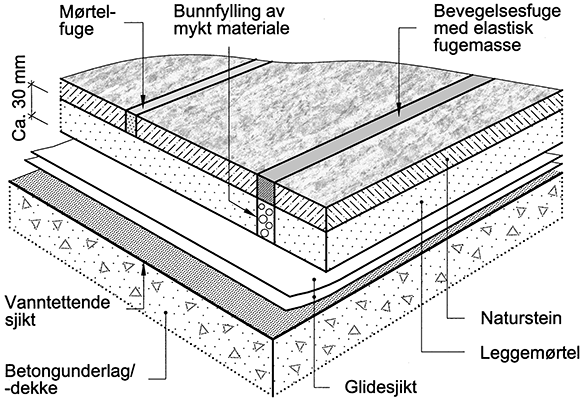Snitt gjennom golv med belegg av naturstein og glidesjikt av to lag plastfolie over et vanntettende sjikt