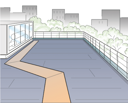 Eksempel på beskyttelse av takbelegg med en ekstra bane farget takbelegget som markerer gangbanen fra utgangsdør til eventuelle tekniske installasjoner på tak eller annet som krever regelmessig ettersyn. Sørg også for nødvendig sikring av takkanter.