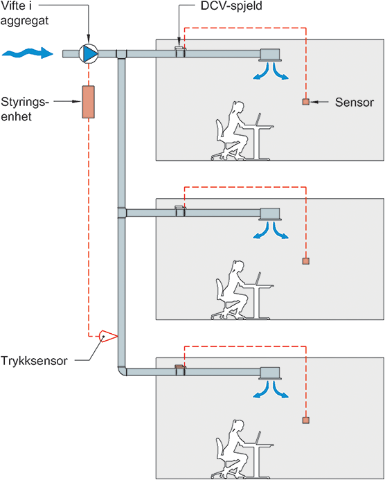 Hovedprinsipper i et DCV-system. Figuren viser tilluftsdelen. Luftmengden i hvert rom reguleres etter målt behov av sensor i rommet. Aggregatvifta regulerer luftmengden etter signal fra en styringsenhet. Regulering og systemoppbygging er ulik for forskjellige systemløsninger. Her får styringsenheten signal fra en trykkføler (konstanttrykkregulert system).