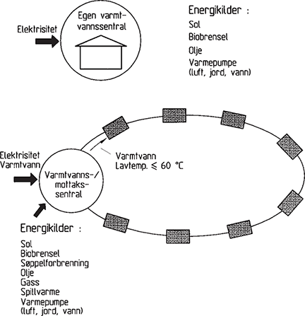 Som et alternativ til egen varmtvannssentral i hver bygning kan varmt vann tilføres en gruppe hus fra en felles varmtvannssentral.