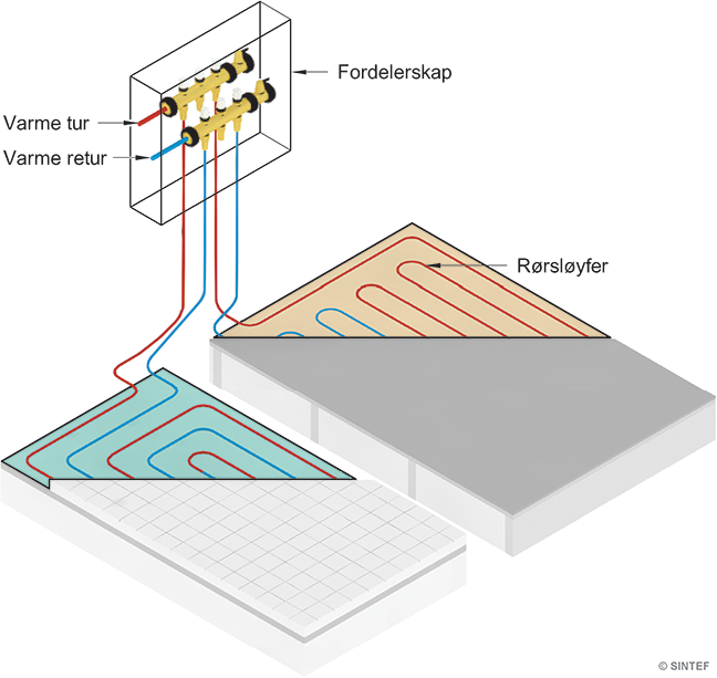 Gulvvarmeanlegg med tur- og returfordelere montert i fordelerskap med to gulvvarmekurser. Anvisningen gjelder for både nye og eksisterende bygninger.