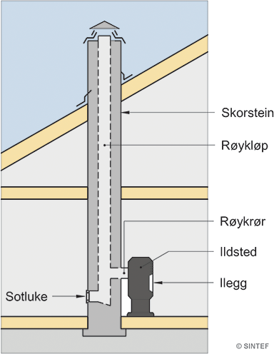 Figuren viser de viktigste komponentene i et fyringsanlegg: ildsted med ilegg, røykrør, røykløp, skorstein og sotluke