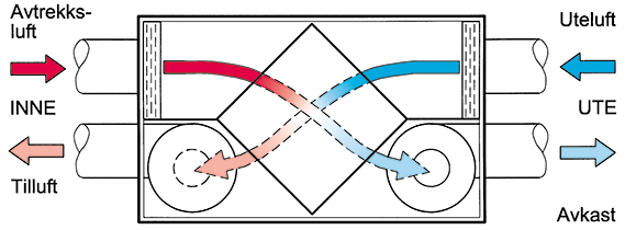 En varmegjenvinner overfører varmen i avtrekksluften til tilluften og bidrar dermed til å gi oppvarmet, trekkfri tilluft og redusert energibehov til oppvarming.