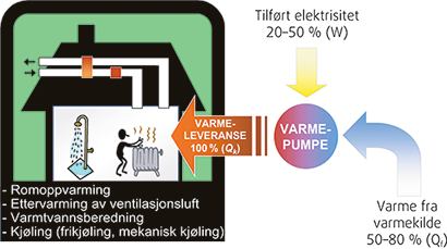 Prinsipp for varmepumpe med varmeopptak fra en ekstern varmekilde, tilførsel av elektrisitet for drift av anlegget og varmeleveranse