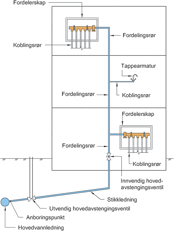 Dimensjonering av rør for vann til brannslokking eller sprinkleranlegg er ikke omtalt. Materialer, utførelse og montering er behandlet i Byggdetaljer 553.117 Rør-i-rør-systemer for vannforsyning og 553.119 Åpne rørinstallasjoner for vannforsyning i boliger.